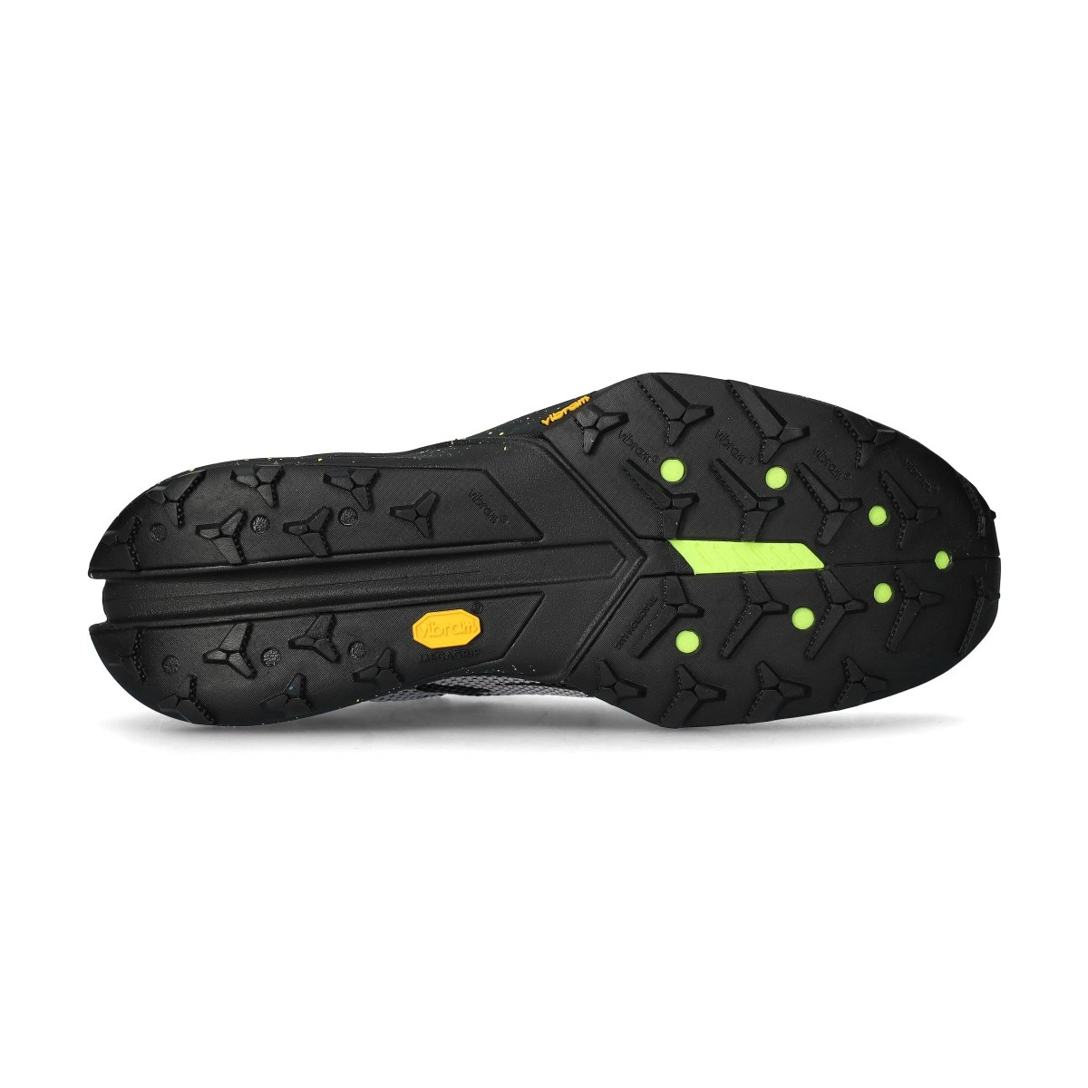 Suela exterior Vibram exclusiva de las Kiger fabricada con Vibram Megagrip, que proporciona una tracción duradera y un agarre perfecto para los terrenos de trail. Tracción estratégica en el antepié y el talón, zonas de gran desgaste, que contribuye a reducir el peso total de las zapatillas. Diseño con tacos que ofrece agarre al subir las cuestas y permite frenar al bajarlas.